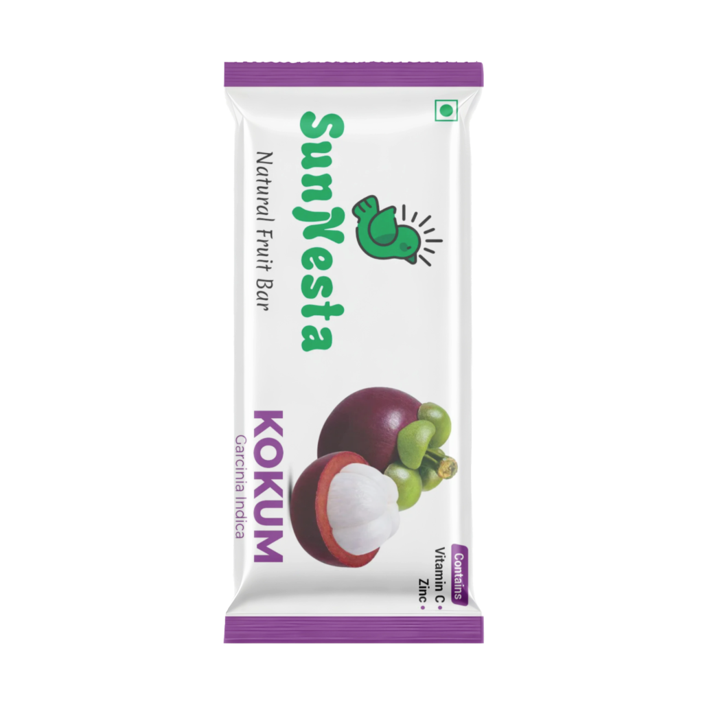 Kokum fruit bars are snacks made from the kokum fruit, which is also known as Garcinia indica. Kokum is a tropical fruit that is native to the Western Ghats region of India. The fruit is small, round, and purple in color, with a tangy and slightly sweet flavor.